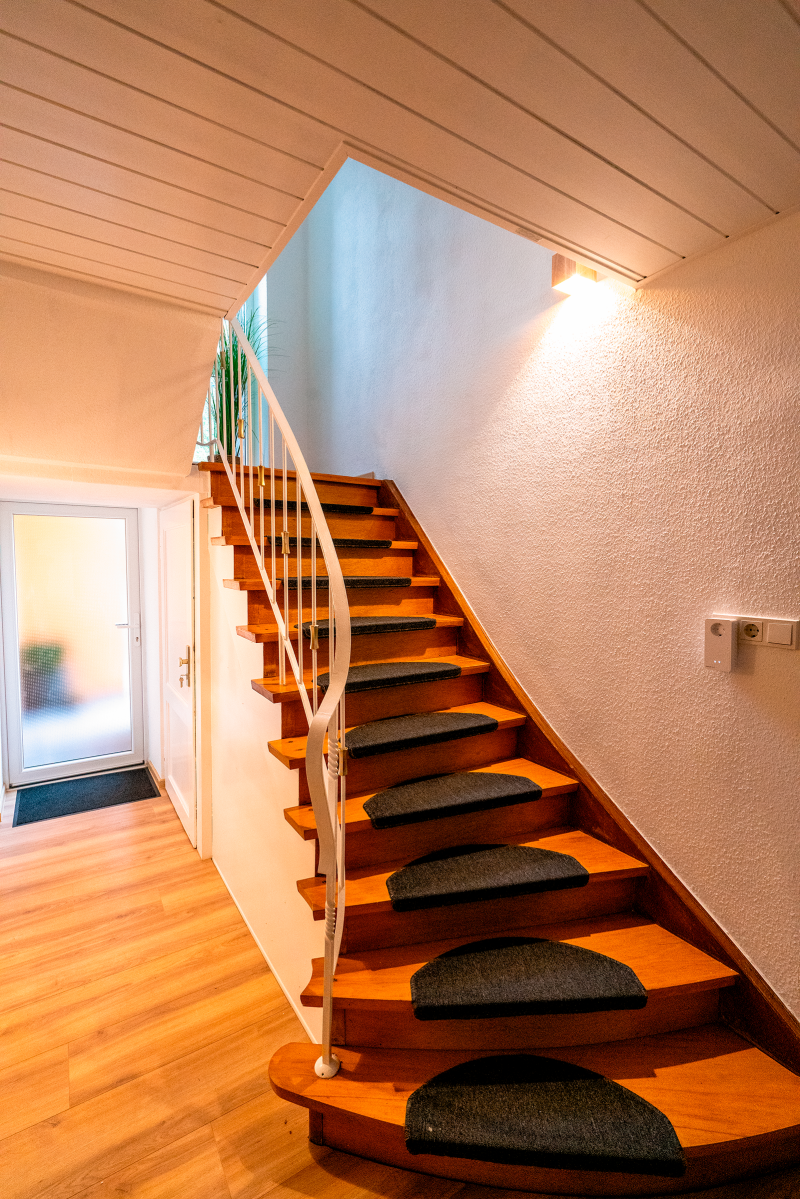 Der separate Eingang befindet sich im rückwärtigen Bereich des 2-Familienhauses. Ein Parkplatz befindet sich vor dem Gebäude.